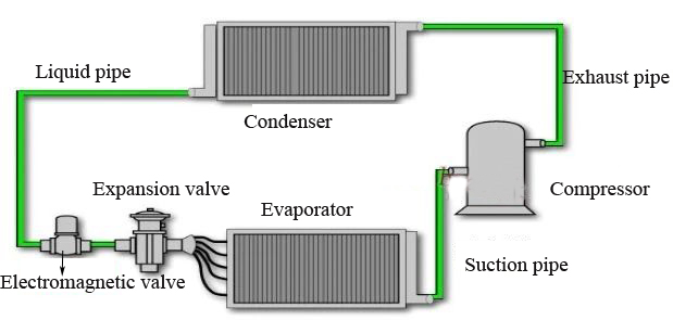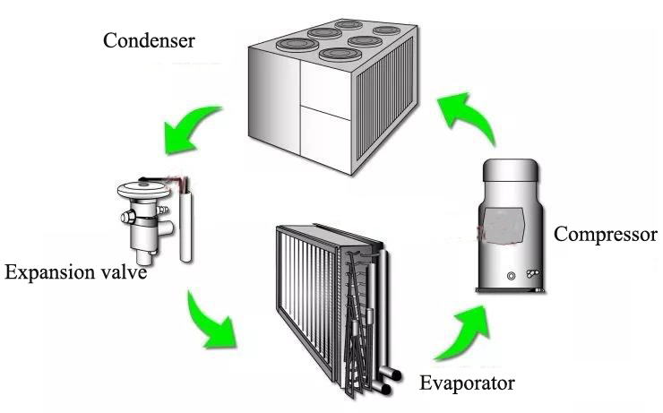 Vapor compression refrigeration belongs to phase change refrigeration, which uses the heat absorption effect when the refrigerant changes from liquid to gas to obtain cold energy. It is composed of four parts: compressor, condenser, throttling mechanism and evaporator. They are connected in turn by pipes to form a closed system.